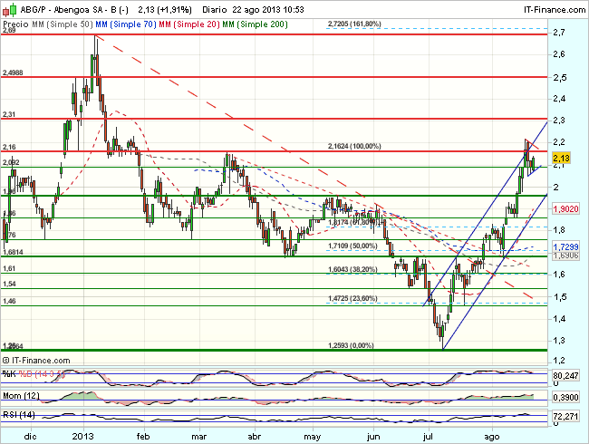 En consecuencia, la tendencia de corto plazo de Abengoa es alcista, con primeros objetivos en los 2,16 – 2,22 euros.
