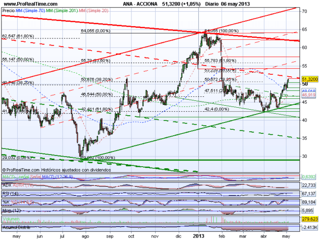 En definitiva, dentro de la tendencia bajista que presenta a largo plazo, ACCIONA, se encuentra actualmente en fase de impulso alcista que probablemente le llevará a superar el techo del primer canal bajista a largo plazo enfrentándose a los 54,21 y 57,5 por debajo de los que existirá posibilidad de vuelta.