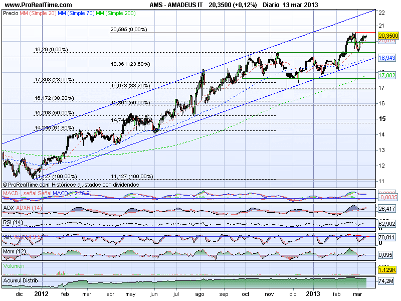 Amadeus viene evolucionando en una perfecta y constante fase alcista desde que el pasado 20 de diciembre de 2.011 realizó un doble suelo en los 11,27.