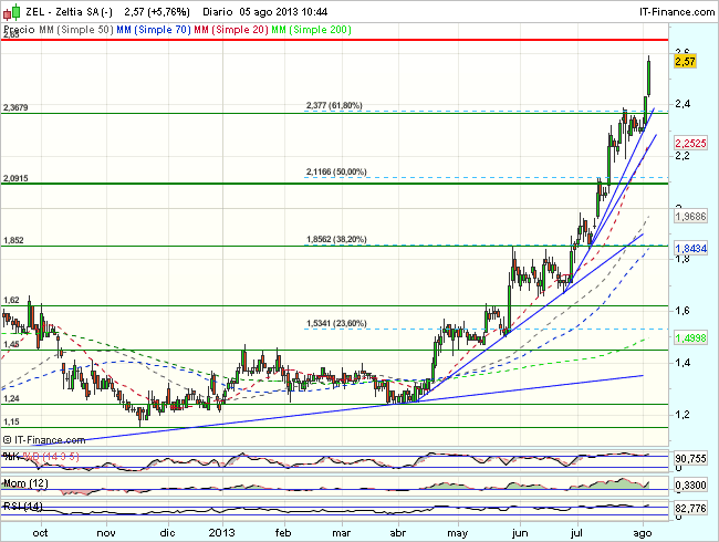 Zeltia, desde que encontrara apoyos en los 1,23 euros, ha acelerado tendencia sucesivamente y con fuerza, superando resistencias y media de 200 sesiones y con el movimiento de hoy, confirma la superación de la media de 200 semanal  y la recuperación del 61,8% de toda la caída previa desde febrero de 2011, mejorando notablemente su aspecto técnico en el medio – largo plazo y abriendo nuevos objetivos naturales al alza en los 3,22 euros.