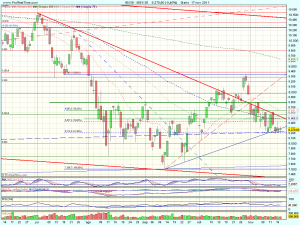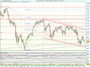 Hoy ha vuelto a hacer mínimos en el soporte de los 8.200 puntos, donde coinciden el 61,8% de retroceso del impulso alcista previo, una directriz alcista de largo plazo que viene desde los mínimos del 96 y la directriz corto plazo. Aunque el nivel esta momentáneamente parando las caídas, el aspecto es débil, por lo que es muy probable que se produzca la perforación a la baja, en dirección a los 8.000 – 7.500 puntos.