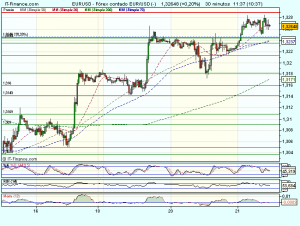 Por lo que se refiere a los indicadores técnicos del Euro – Dólar, los osciladores diarios son alcistas, con estocástico en fuerte sobrecompra y RSI en sobrecompra y se observa mejoría de momentum. Los intradíarios por su parte son bajistas,  mostrando presión vendedora, en la resistencia de 1,329.