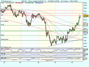 El cruce EUR/JPY, acelera su recuperación tras consolidar sobre el soporte de los 106 euros, coincidente con el 61,8% de retroceso de toda la caída previa desde octubre. Cotiza con subidas del 0,97% hasta los 107,66 yenes.