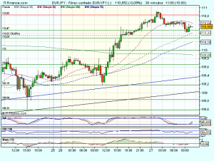 El cruce EUR/JPY, se mantiene en la sesión de hoy bajo ligera presión bajista, tras las fuertes alzas de ayer, aunque parece estar encontrando algún apoyo en los 110,4 yenes, desde donde reacciona al alza. Cotiza con perdidas del 0.09% hasta los 110,54 yenes.