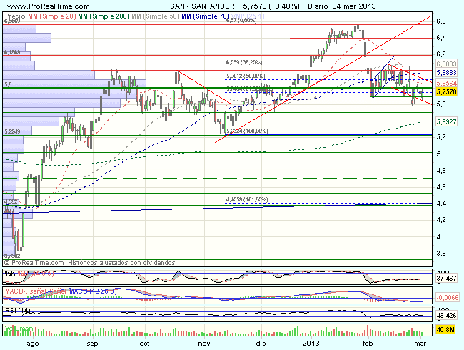Mientras el Banco de Santander aguante sobre los 5,58 euros el impulso de corto plazo permanecerá vigente y a mayor plazo, mientras respete los 5,23 euros, hay posibilidades de recuperación hacia los 6,6 euros, su pérdida, por el contrario, significaría un notable deterioro técnico a medio largo plazo y abriría la vía hacia los 4,5 – 4 euros.