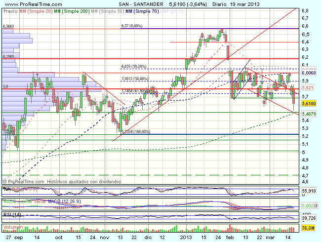 Mientras el Banco de Santander aguante sobre los 5,5 euros el impulso de corto plazo permanecerá vigente y a mayor plazo, mientras respete los 5,23 euros, hay posibilidades de recuperación hacia los 6,6 euros, su pérdida, por el contrario, significaría un notable deterioro técnico a medio largo plazo y abriría la vía hacia los 4,5 – 4 euros.