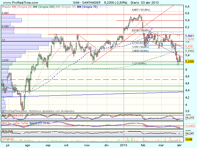 En consecuencia, la tendencia del Banco de Santander es bajista, aunque en proceso de rebote, con primeros objetivos en los 5,5 – 5,69 euros