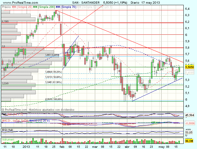 En consecuencia, la tendencia de corto plazo del Banco de Santander es alcista, con primeros objetivos en los 5,7 – 5,8 euros