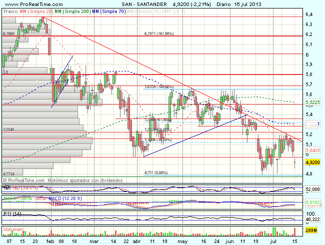 LONE__El Banco de Santander se encuentra bajo presión vendedora en la sesión de hoy, tras las fuertes caídas de ayer y cotiza con perdidas del 0,81% hasta los 4,88 euros, resolviendo a la baja el doji de indecisión que dejo en la sesión de ayer.