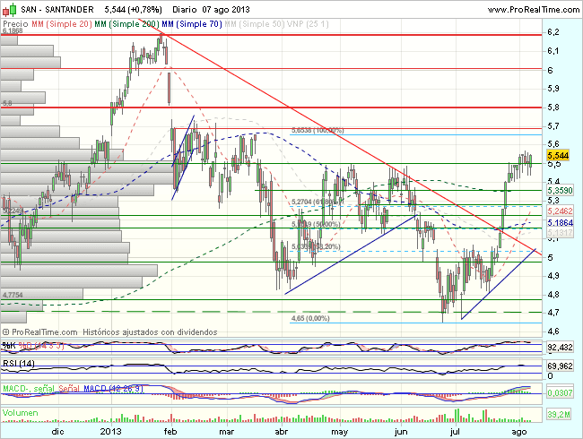 En consecuencia, la tendencia de corto plazo del Banco de Santander es alcista, con primeros objetivos en los 5,65 – 5,8 euros