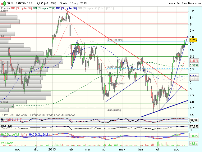Dada la fuerte sobrecompra y el agotamiento de volumen no seria extraño asistir a una consolidación en el entorno de los 5,8, si bien, mientras el Banco de Santander se mantenga cotizando sobre los 5,4 euros, el sesgo permanecerá alcista, su perforación, por el contrario, abriría la vía a una mayor consolidación en dirección a los 5,28 – 5,2 euros.
