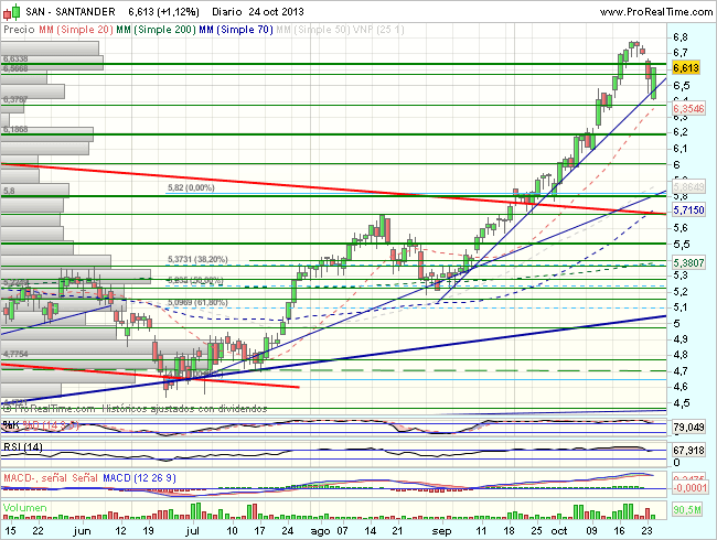 En el corto plazo, el Banco de Santander encuentra obstaculos , encuentra obstaculos en los 6,775 euros, que fuerzan una consolidacion hacia la directriz alcista, desde donde vuelve a impulsarse, con primeros objetivos en los 6,64 – 6,8 euros.
