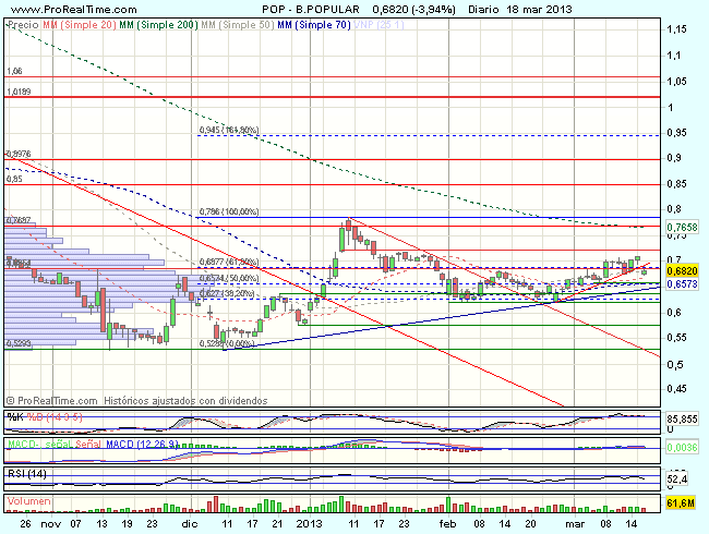 La tendencia del Banco Popular en el largo plazo es muy bajista, si bien, en el corto plazo, tras realizar una formación de doble suelo en el soporte de los 0,528 euros, ha mantenido una tendencia alcista definida, que se ha visto frenada ante la resistencia en los 0,786 euros, forzando una consolidación lateral alcista.
