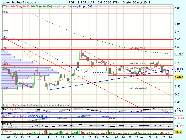 La tendencia del Banco Popular en el largo plazo es muy bajista, si bien, en el corto plazo, tras realizar una formación de doble suelo en el soporte de los 0,528 euros, ha mantenido una tendencia alcista definida, que se ha visto frenada ante la resistencia en los 0,786 euros, forzando una consolidación lateral con base en el soporte de los 0,62 euros.