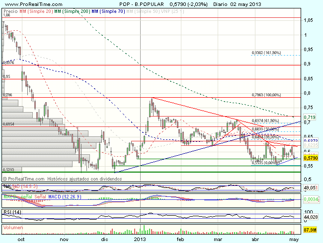 Mientras el Banco Popular se mantenga sobre los 0,55 euros, existen posibilidades de rebote, su perdida invalidaría el escenario y abriría la vía a mayores caídas en dirección a los 0,53 euros.