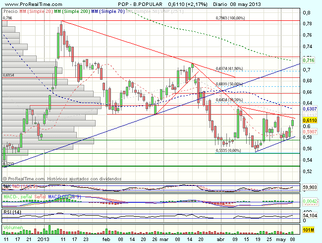 La tendencia del Banco Popular en el largo plazo es muy bajista, si bien, en el corto plazo,  tras realizar una formación de doble suelo en el soporte de los 0,528 euros, intenta las alzas, que se han visto frenadas ante la resistencia en los 0,786 euros, dando lugar a un nuevo impulso bajista, que esta encontrando apoyos ante el soporte de los 0,55 euros, dibujando una formación triangular.