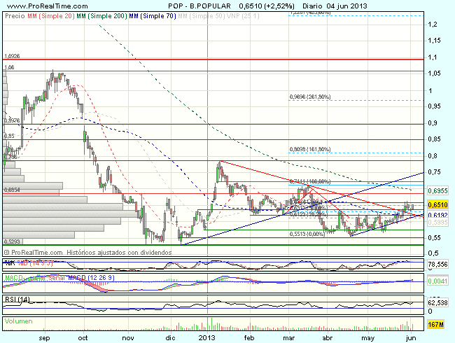 La tendencia del Banco Popular en el largo plazo es muy bajista, si bien, en el corto plazo,  tras realizar una formación de doble suelo en el soporte de los 0,528 euros, intenta las alzas, que se han visto frenadas ante la resistencia en los 0,786 euros, dando lugar a un nuevo impulso bajista, que esta encontrando apoyos ante el soporte de los 0,55 euros, desde donde se impulsa nuevamente al alza