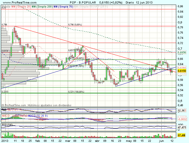 La tendencia del Banco Popular en el largo plazo es muy bajista, si bien, en el corto plazo, tras realizar una formación de doble suelo en el soporte de los 0,528 euros, intenta las alzas, que se han visto frenadas ante la resistencia en los 0,786 euros, dando lugar a un nuevo impulso bajista, que tras encontrar apoyos ante el soporte de los 0,55 euros, se impulsa nuevamente al alza hasta los 0,66 euros.