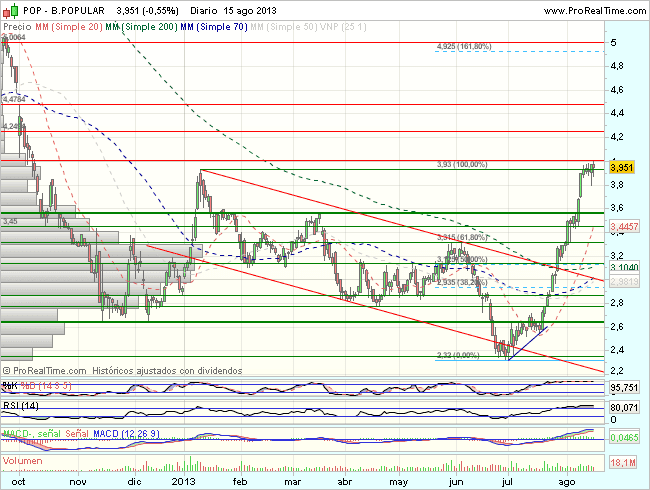 El Banco Popular, se mantiene bajo ligera presión compradora en la sesión de hoy, tras el fracaso ayer ante la resistencia de los 4 euros y cotiza con beneficios del 0,61% en los 3,9750 euros, confirmando la superación del 100% de recuperación de toda la caída previa, desde enero.