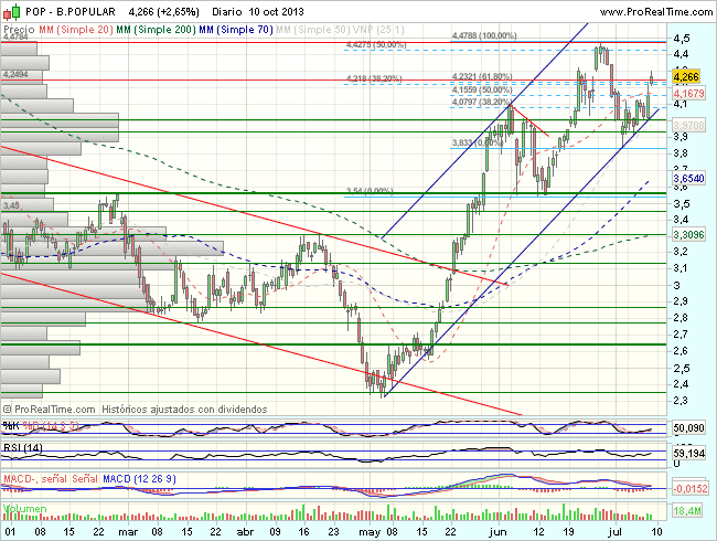 La tendencia del Banco Popular en el largo plazo es muy bajista, si bien, en el corto plazo, tras encontrar apoyos en el soporte de los 2,35 euros, inicia un movimiento alcista, que va acelerando tendencia, hasta los 4,5 euros, que fuerzan una consolidación.