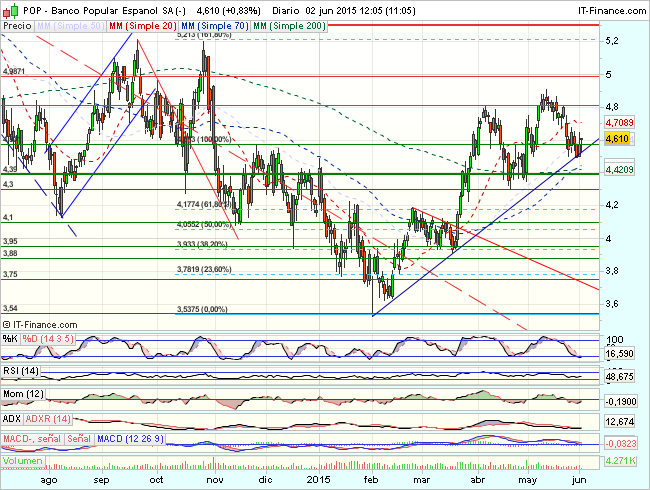 En el corto plazo, el Banco Popular encuentra apoyos en los 3,53 euros, para un pullback a resistencias en 4,9 euros, que fuerzan una consolidación a la directriz alcista, desde donde rebota con primeros objetivos en los 4,8-4,9 euros.