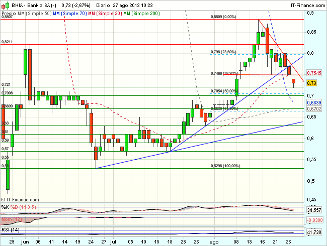 LONE__Bankia vuelve a encontrarse bajo fuerte presión vendedora en la sesión de hoy, y cotiza con perdidas del 2,80% en los 0,73 euros, amenazando el soporte de los 0,72 euros.