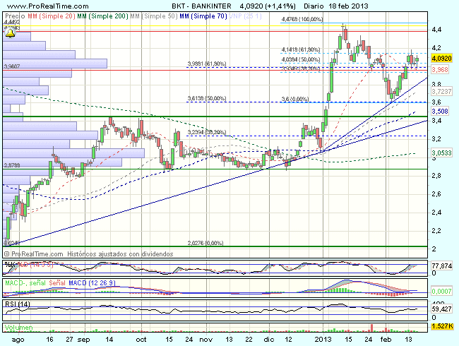 Mientras Bankinter se mantenga sobre los 3,95 euros, soporte fuerte, ya que en el coinciden, soporte estático, media de corto plazo y nivel del 61,8% de recuperación de todo el impulso bajista previo desde febrero de 2012, el sesgo de corto plazo permanece alcista, la perdida de los 3,95 euros, por el contrario, complicaría su aspecto técnico y abriría nuevos objetivos de caída en dirección a los 3,6 – 3,45 euros.