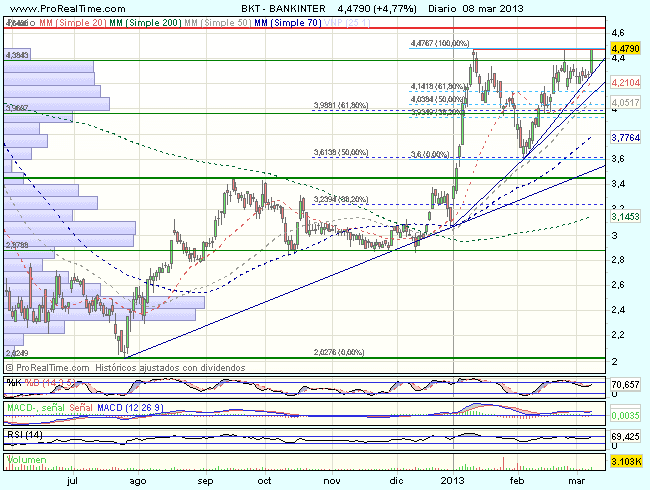 Mientras Bankinter se mantenga sobre los 3,95 euros, soporte fuerte, ya que en el coinciden, soporte estático, media de corto plazo y nivel del 61,8% de recuperación de todo el impulso bajista previo desde febrero de 2012, el sesgo de corto plazo permanece alcista,  la perdida de los 3,95 euros, por el contrario, complicaría su aspecto técnico y abriría nuevos objetivos de caída en dirección a los 3,6 – 3,45 euros.