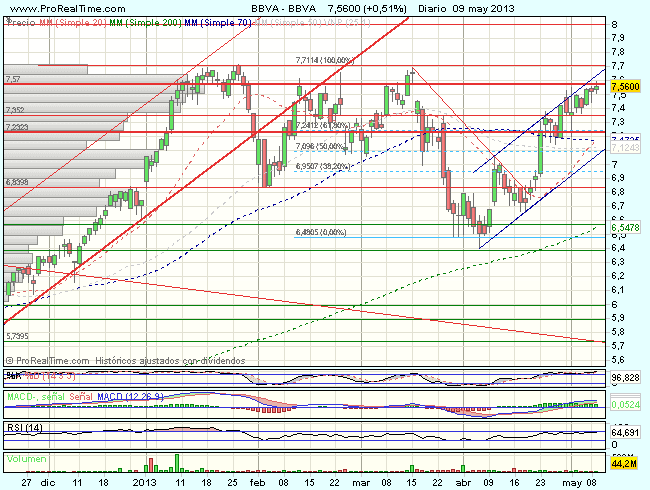El BBVA, desde los 4,2 euros, mantiene una clara tendencia alcista que se vio acelerada tras realizar un doble suelo en el nivel de los 5,7 euros. En el medio plazo, tras encontrar obstáculos en forma de doble techo en los 7,7 euros, confirmado con la perdida de los 6,83 euros, inicia una consolidación hasta los 6,38 desde donde inicia un nuevo impulso alcista. En esta sesión, ataca la resistencia en los 7,575 euros, ultimo obstáculo antes de los máximos en los 7,7 euros.