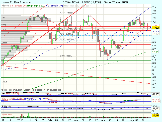 El BBVA, desde los 4,2 euros, mantiene una clara tendencia alcista que se vio acelerada tras realizar un doble suelo en el nivel de los 5,7 euros. En el medio plazo, tras encontrar obstáculos en forma de doble techo en los 7,7 euros, confirmado con la perdida de los 6,83 euros, inicia una consolidación hasta los 6,38 desde donde inicia un nuevo impulso alcista, que se ve nuevamente frenado ante los 7,7.