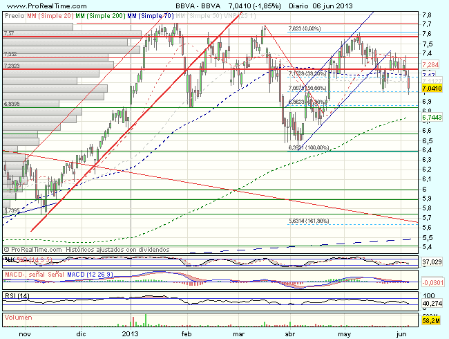 El BBVA, desde los 4,2 euros, mantenía una clara tendencia alcista que se vio acelerada tras realizar un doble suelo en el nivel de los 5,7 euros. En el medio plazo, tras encontrar obstáculos en forma de doble techo en los 7,7 euros, confirmado con la perdida de los 6,83 euros, inicia una consolidación lateral bajista con techo en los 7,7 euros.
