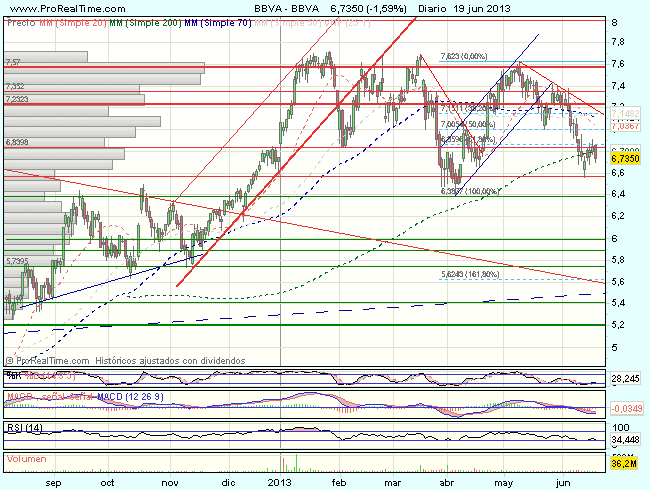 El BBVA, se encuentra bajo fuerte presión vendedora en la sesión de hoy tras las fuertes caídas de ayer, y cotiza con perdidas del 2,69%, en los 6,5540 euros, perforando el soporte relevante de los 6,57 euros.