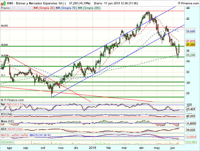 En consecuencia, la tendencia de BME en el corto plazo es alcista, con primeros objetivos en los 38,40 – 40,5 euros.