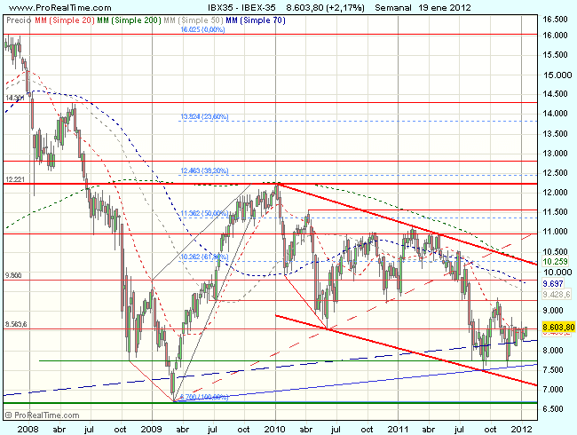 En el medio plazo, el selectivo delmercado continuo, encuentra apoyo en los 8.560 puntos, desde donde reacciona, para encontrar techo en los 11.000 puntos, dando lugar a un amplio movimiento lateral entre dicho techo y suelo en los 9.200 puntos.