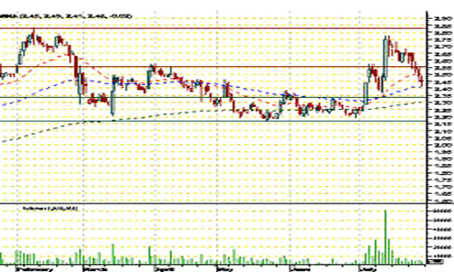 Con esto, ya tenemos el grafico, la plataforma le pedimos que nos ponga las medias (exponenciales) de 25, 70 y 200 sesiones que pondremos en rojo, azul y verde para no liarnos, elegimos el tipo con que queremos trabajar (por Ej. Candlestick) salvamos el área de trabajo si es necesario y ya todos los gráficos nos saldrán igual, ya podemos empezar a tirar rayas: