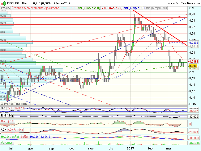 En el corto plazo, Deoleo  rebota en un pullback a resistencias en 0,26 euros, que fuerzan un trhrowback a soportes en 0,2 euros, desde donde rebota, con primeros objetivos en los 0,23 – 0,25 euros.