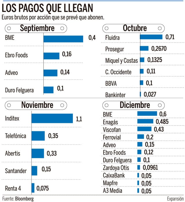 Pagos más inmediatos BME, Ebro Foods, Adveo y Duro Felguera son algunas de las compañías que remuneran a sus accionistas en las próximas semanas. Ebro, por ejemplo, paga 0,16 euros el próximo martes, un 6,6% más que un año antes. Pero es que además la empresa de alimentación tiene previsto un pago extra de 0,12 euros brutos en efectivo, con cargo a reservas de libre disposición, que llevará a cabo el 10 de diciembre. Los 0,28 euros previstos para los próximos meses respecto a su cotización actual suponen un retorno del dividendo del 1,7% que sube al 3,6% si se tiene en cuenta el total de 12 meses.