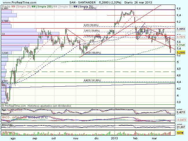 Dada la fuerte sobreventa y la velocidad de la caída, no seria extraño que se produjeran rebotes, sin embargo, no serán significativos mientras la cotización del Banco de Santander no supere los 6 euros.