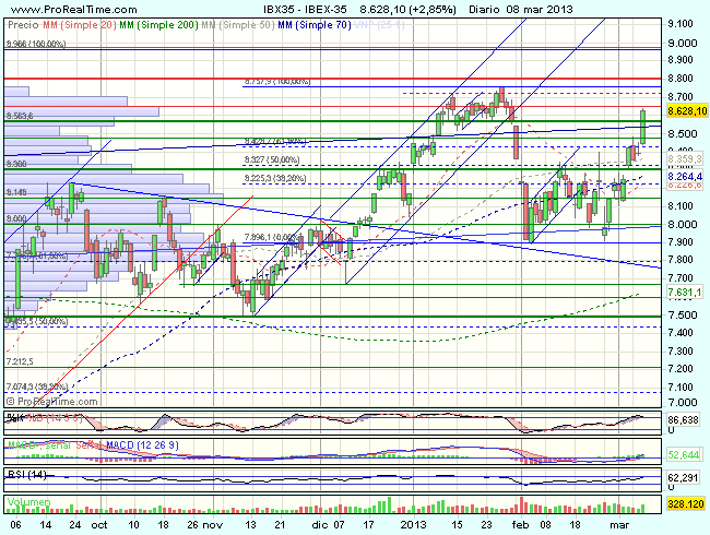 El Ibex 35, se mantenía durante la sesión bajo fuerte presión compradora, y terminaba cerrando con beneficios del 2,85%, en los 8.628,10 puntos, superando con fuerza la resistencia relevante de los 8.500 puntos y a un paso ya de la de 8.650 puntos, última resistencia intermedia antes de los máximos. Cierra así su mejor semana desde septiembre con ganancias del 5,4%.