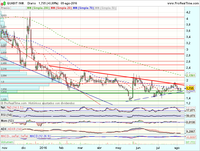 La operación coincide con la mejoría en los indicadores del sector y de la propia compañía que cerró el tercer trimestre de 2014 con un beneficio neto de 56,3 millones de euros y, según informa la compañía, en la actualidad cuenta con una “estructura financiera consolidada y una situación patrimonial saneada”. Esta mejora de su actividad se está reflejando en el parqué. (Ver analisis tecnico de Quabit )