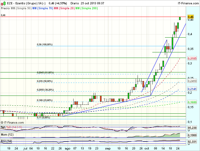 En consecuencia, la tendencia de de Ezentis en el corto plazo es alcista,  con primeros onjetivos en los 0,5– 0,53 euros.