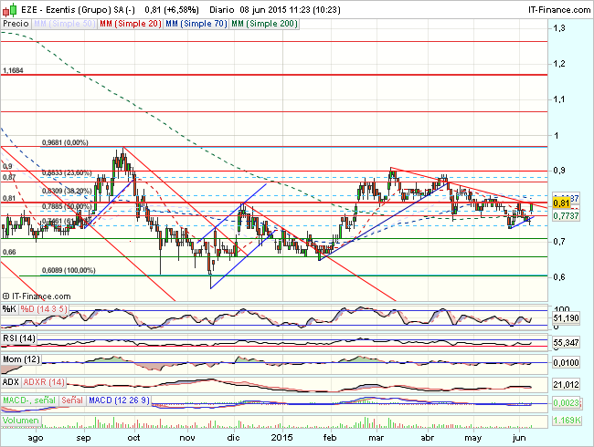 En el corto plazo, Ezentis se impulsa hasta resistencias en 0,91 euros, que fuerzan un trhrowback a soportes en 0,74 euros, desde donde rebota, con primeros objetivos en los 0,81 – 0,87 euros .