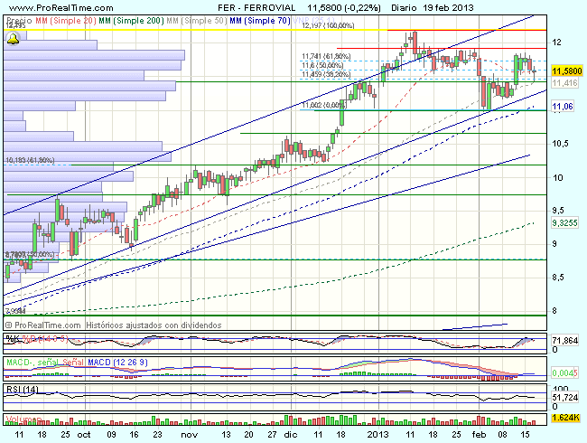 Mientras Ferrovial se mantenga sobre los 11 euros, el sesgo permanecerá alcista, la perdida de los 11 euros, por el contrario, complicaría su aspecto técnico y abriría nuevos objetivos de caída en dirección a los 10,6 – 10,18 euros.