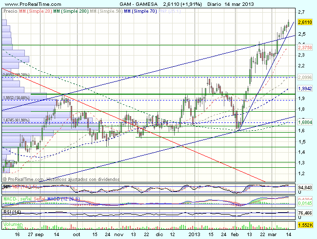 Gamesa sigue bajo presión compradora, durante la sesión de hoy, y cotiza con beneficios del 1,03%, hasta los 2,6380 euros, manteniendo el impulso alcista iniciado en la media de 200 sesiones.