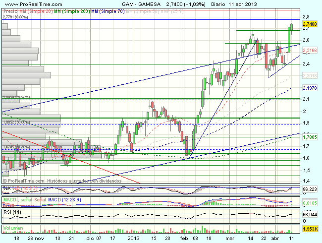 En la sesión de hoy, inicia un movimiento de consolidación, que no pondrá en peligro el impulso alcista en el coto plazo, mientras Gamesa se mantenga sobre los 2,5 euros, y a mayor plazo, el impulso alcista permanecerá vigente, mientras cotice sobre los 2,29 euros.