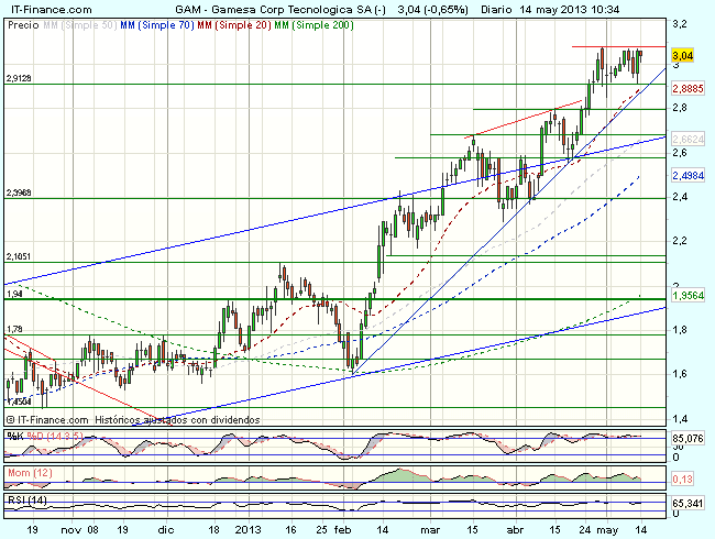 Gamesa se encuentra bajo ligera presión vendedora en la sesión de hoy, tras las fuertes subidas de ayer y cotiza con perdidas del 0,59%, hasta los 3,046 euros, prácticamente en la resistencia y máximos previos en los 3,08 euros.
