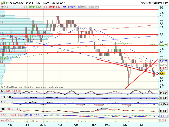 En el corto plazo, GALQ rebota en un pullback a resistencias en 2,2 euros,que fuerzan un trhrowback a soportes en 1,7 euros, desde donde rebota con primeros objetivos en los 2 – 2,1 euros.