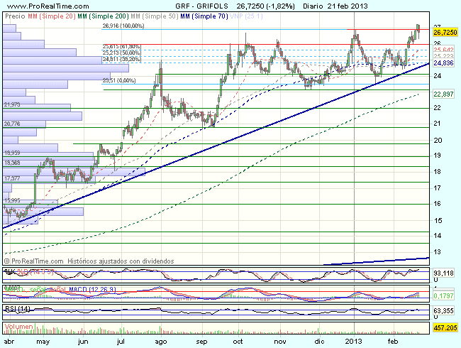 El aspecto técnico de Grifols es espectacular, tendencias de largo medio y corto plazo, perfectamente alcistas y consolidaciones de continuidad suaves para tomar impulso, si bien, en los últimos meses esta derivando en un rango lateral, con techo en los 26,87 euros, que intenta superar en las ultimas sesiones.
