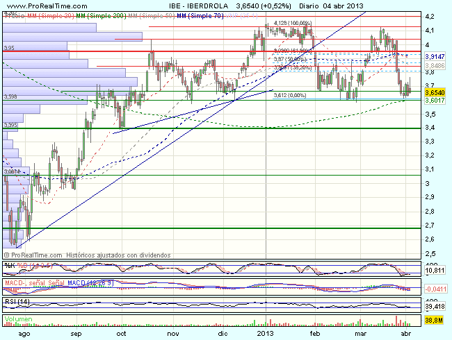 La tendencia de Iberdrola sigue siendo alcista, aunque tras encontrar obstáculos en los 4,15 euros, inicia un rango lateral con base en los 3,6 euros, que sirven de freno a las caídas, probando su eficacia como soporte en varias ocasiones.