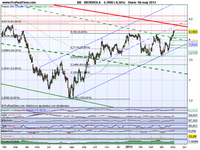 En definitiva IBERDROLA se encuentra alcista en el medio y corto plazo, aunque mientras se mantenga bajo los 4,35 euros, en donde confluye directriz intermedia alcista a medio plazo y directriz superior bajista a largo, existe peligro de vuelta. Su superación por el contrario abriría nuevos objetivos al alza en las resistencias en 4,38 y 4,45 euros.